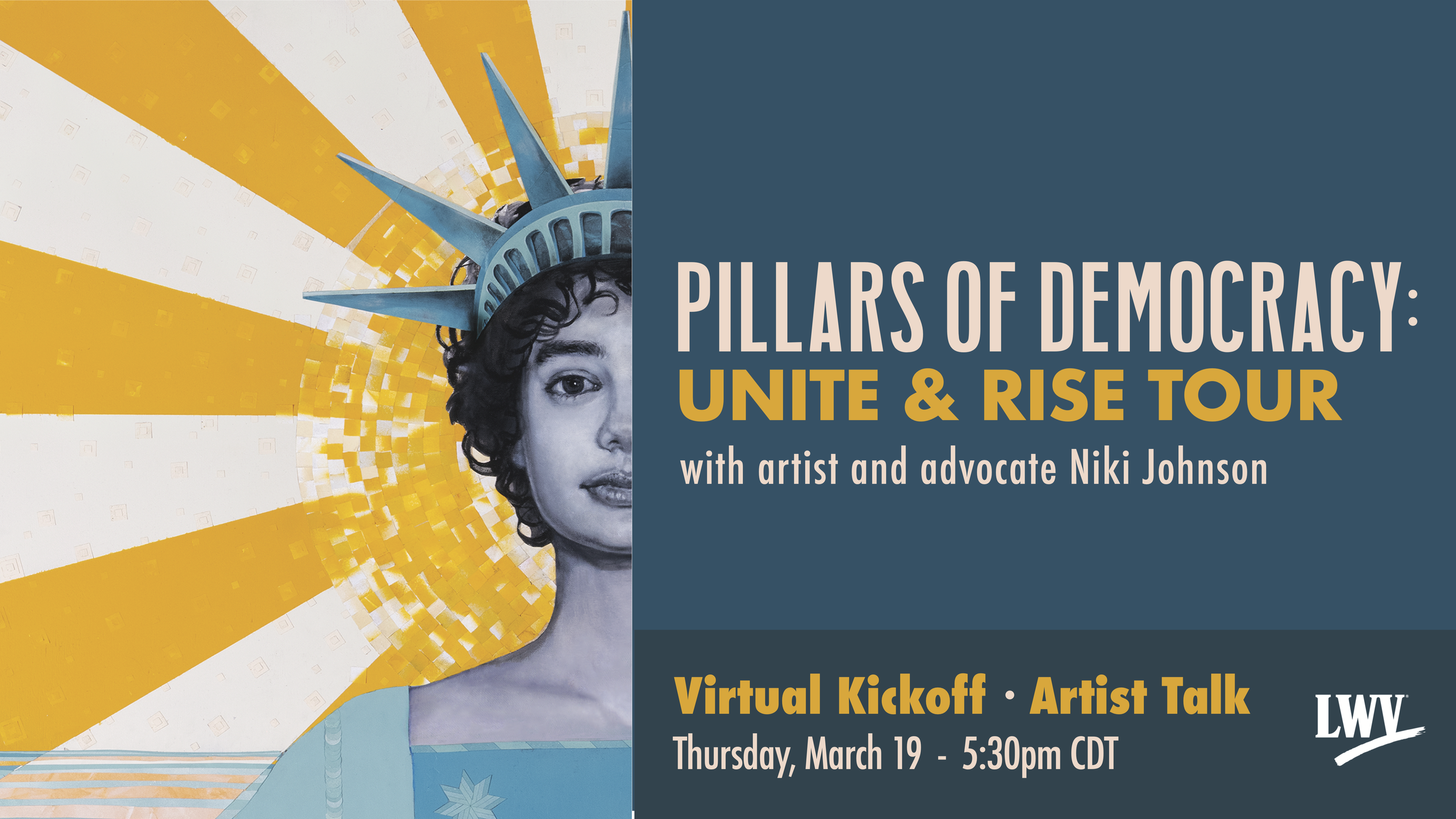 LWVIL is proud to partner with artist Niki Johnson to bring her epic mixed media portrait series of first-time women voters to sites across Illinois. The Pillars of Democracy: Unite and Rise tour begins this March in Chicago, then travels to Schaumburg, Galesburg, and Springfield, featuring artist talks, community action opportunities, and hands-on workshops.